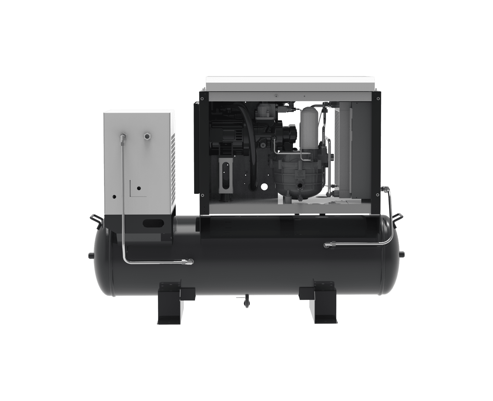 El equipo incluye secador de aire frigorífico integrado, lo que permite eliminar la humedad del aire comprimido y proteger herramientas, maquinaria y procesos productivos. Gracias a su diseño compacto e integrado, combina compresor, tanque y sistema de secado en una sola unidad, optimizando el espacio y simplificando la instalación.